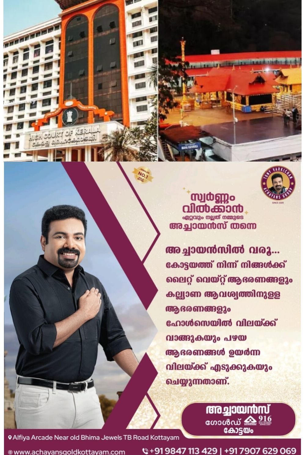 നടപടിക്രമങ്ങൾ പാലിക്കാതെ സ്വർണം കൊണ്ടുപോയതിൽ പിഴവ് പറ്റിയെന്ന് ദേവസ്വം ബോർഡ് അറിയിച്ചു. അതേസമയം, സ്വർണ്ണം പൂശാൻ കൊണ്ടുപോയ സ്വർണപാളി അടിയന്തരമായി തിരിച്ചെത്തിക്കണമെന്നില്ലെന്നും ഹൈക്കോടതി അറിയിച്ചു. എത്ര സ്വർണം മുൻപ് ഉണ്ടായിരുന്നു എന്നതടക്കം പരിശോധിക്കട്ടെയെന്ന് കോടതി. അറ്റകുറ്റപ്പണിയുടെ സ്പോൺസറെ അടക്കം കക്ഷി ചേർത്തു.