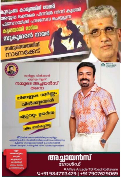 'അയ്യപ്പവിശ്വാസികളായ സമുദായാംഗങ്ങളെ പിന്നില് നിന്ന് കുത്തി വഞ്ചിച്ച് പിണറായി വിജയന് പാദസേവ ചെയ്യുന്ന എന്എസ്എസ് ജനറല് സെക്രട്ടറി രാജിവെക്കണമെന്ന് കോട്ടയം ചേന്നാട് വെച്ച ഫ്ളെക്സില് പറയുന്നു. കഴിഞ്ഞ ദിവസം പ്രത്യക്ഷപ്പെട്ട പോസ്റ്ററുകളില് പ്രതിഷേധക്കാര് ആരാണെന്ന് സൂചിപ്പിച്ചിരുന്നില്ല.