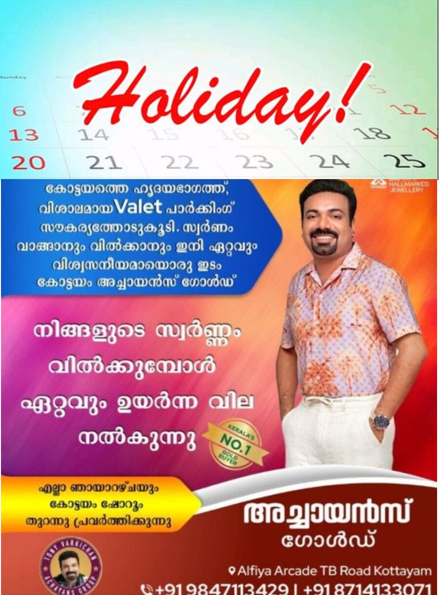 ജനുവരി രണ്ട് മന്നം ജയന്തി, ജനുവരി 26 റിപ്ലബ്ലിക് ദിനം. മാർച്ച് 20 റംസാൻ. ഏപ്രിൽ രണ്ട് പെസഹാ വ്യാഴം, ഏപ്രിൽ മൂന്ന് ദുഃഖ വെള്ളി, ഏപ്രിൽ14 അംബേദ്കർ ജയന്തി, ഏപ്രിൽ15 വിഷു. മേയ് 1 മേയ്ദിനം, മേയ് 27 ബക്രീദ്. ജൂൺ 25 മുഹറം. ആഗസ്റ്റ് 12 കർക്കടകവാവ്, ആഗസ്റ്റ്15 സ്വാതന്ത്ര്യദിനം, ആഗസ്റ്റ് 25 ഒന്നാം ഓണം, 26 തിരുവോണം, 27 മൂന്നാം ഓണം, 28 നാലാം ഓണം, ശ്രീനാരായണ ഗുരുജയന്തി, അയ്യങ്കാളി ജയന്തി. സെപ്റ്റംബർ നാല് ശ്രീകൃഷ്ണജയന്തി, സെപ്റ്റംബർ 21 ശ്രീനാരായണഗുരു സമാധി. ഒക്ടോബർ രണ്ട് ഗാന്ധിജയന്തി, 20 മഹാനവമി, 21 വിജയദശമി ഡിസംബർ 25 ക്രിസ്മസ്.