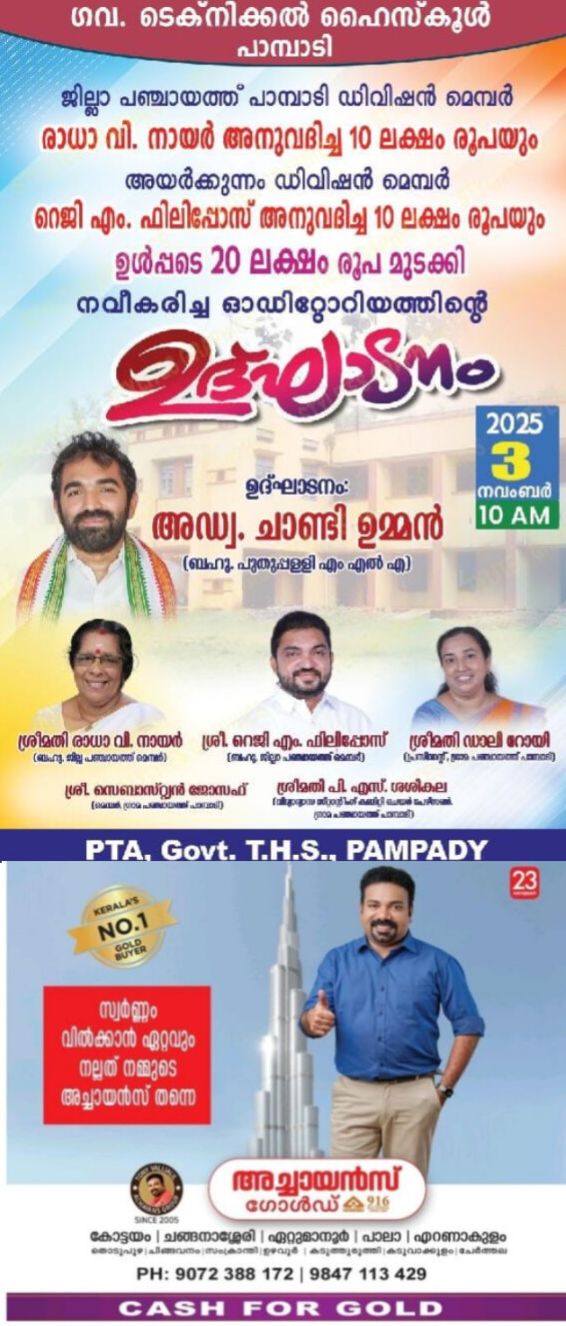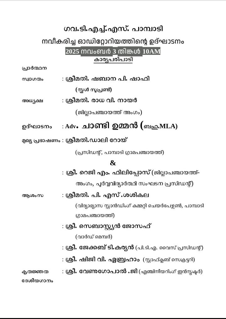 നമ്മുടെ ടെക്നിക്കൽ സ്കൂളിലെ നവീകരിച്ച ഓഡിറ്റോറിയത്തിന്റെ ഉദ്ഘാടനം 03/11/25 തിങ്കൾ രാവിലെ 10 മണിയ്ക്ക് നടത്തപ്പെടുകയാണ്. ശോച്യാവസ്ഥയിൽ ആയിരുന്ന ഓഡിറ്റോറിയം ജില്ലാ പഞ്ചായത്ത് പദ്ധതിയിൽ ഉൾപ്പെടുത്തി ആണ് നവീകരിച്ചത്. അഡ്വ. ചാണ്ടി ഉമ്മൻ എം. എൽ. എ. ഉദ്ഘാടന കർമ്മം നിർവഹിക്കും. എല്ലാവരെയും ഇ പരിപാടിയിലേയ്ക്ക് ഹാർദ്ധവമായി സ്വാഗതം ചെയ്യുന്നു. സ്ഥലത്തുള്ള എല്ലാ പൂർവ്വ വിദ്യാർത്ഥികളും സാന്നിധ്യം കൊണ്ട് ഈ ചടങ്ങിനെ ധന്യമാക്കണമെന്ന് വിനീതമായി അഭ്യർത്ഥിക്കുന്നു.