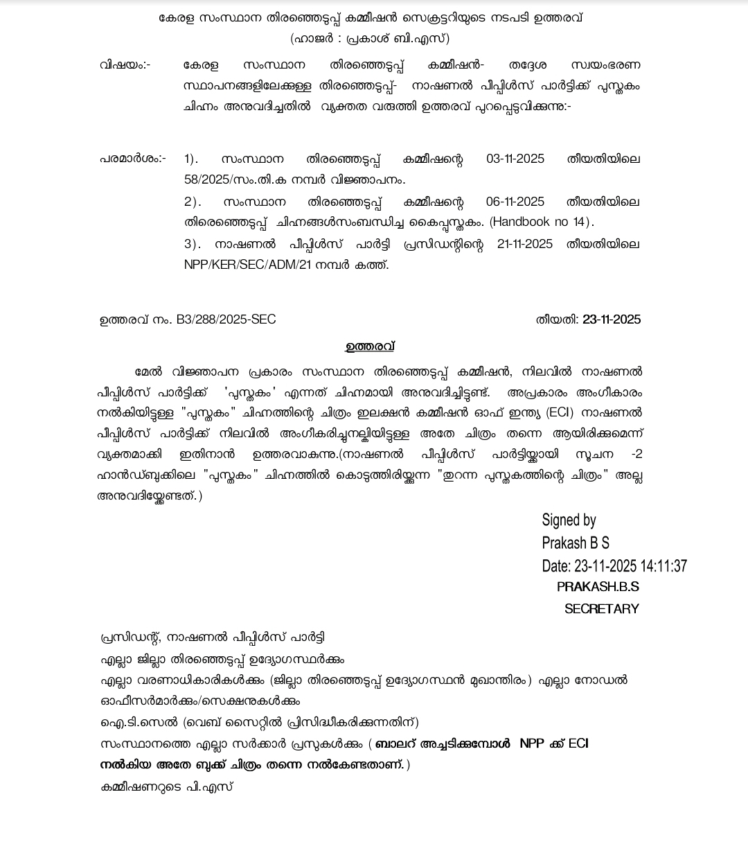 കോട്ടയം:21/11/25 ൽ പാർട്ടി സംസ്ഥാന അധ്യക്ഷൻ ശ്രീ തോമസ് കെ ടി ഇതു സംബന്ധിച്ച് തിരഞ്ഞെടുപ്പ് കമ്മീഷന് പരാതി നൽകിയിരുന്നു.