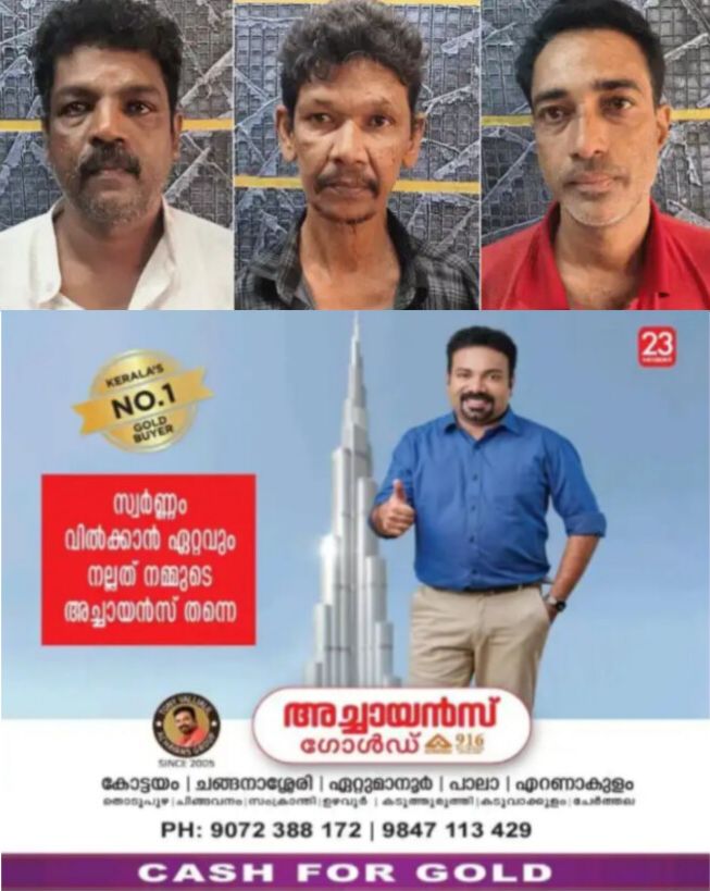 കെഎസ്എഫ് ഇ യുടെ തുറവൂർ ബ്രാഞ്ചിലാണ് മുക്കുപണ്ടം പണയം വെച്ച് പണം തട്ടിയത്. എറണാകുളം രായമംഗലം പഞ്ചായത്ത് പുല്ലുവഴി കാളംമാലിയില് എല്ദോ വർഗീസ്, പുല്ലുകുഴി ഞെഴുവങ്കൻ വീട്ടില് 48 കാരനായ ജിബി, വാരപ്പെട്ടി പാറയില്കുടി ചാലില് 48 കാരനായ ബിജു സി എ എന്നിവരാണ് പിടിയിലായത്.