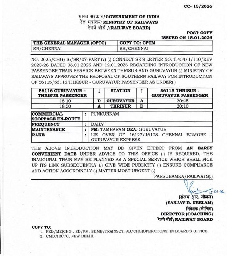 ഗുരുവായൂർ - തൃശ്ശൂർ റൂട്ടിൽ പുതിയ ട്രെയിൻ സർവീസ് അനുവദിച്ച സന്തോഷവാർത്ത പങ്കുവെക്കുന്നു! ഏറെ കാലമായി സോഷ്യൽ മീഡിയയിലൂടെയും നേരിട്ടും നിങ്ങൾ നല്കിയ അഭ്യര്ത്ഥനകള്ക്കും കാത്തിരിപ്പിനും ഇപ്പോൾ ശുഭകരമായ ഒരു തീരുമാനമായിരിക്കുകയാണ്.