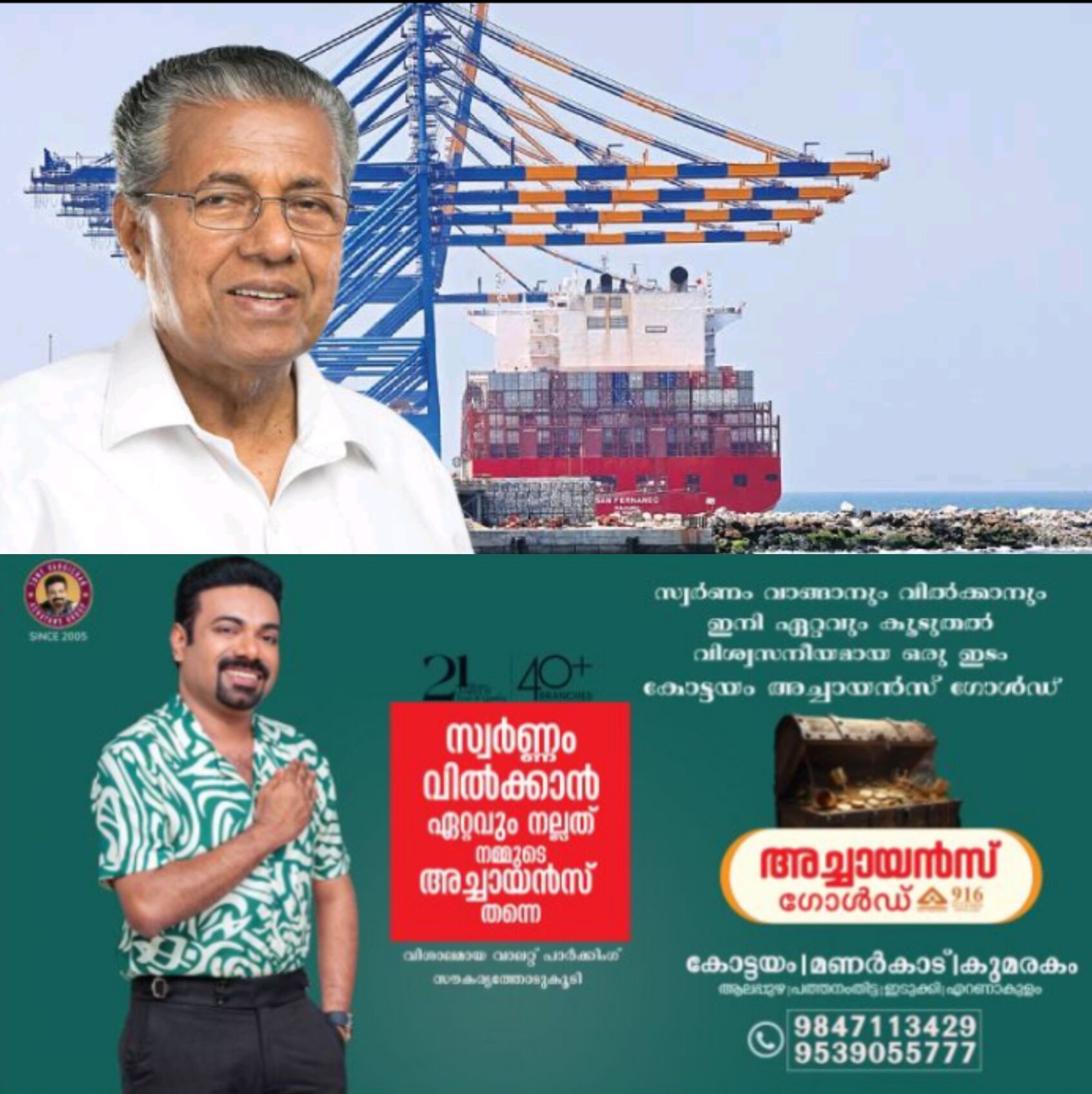 നാടിന്റെ വികസനവും ക്ഷേമവും ഉറപ്പാക്കുന്ന ഒരു നവകേരളത്തിനായി നമുക്ക് ഒരുമിച്ച് മുന്നേറാം എന്ന് അറിയിച്ചുകൊണ്ട് വിഴിഞ്ഞം പദ്ധതിയുടെ രണ്ടാം ഘട്ടത്തിന്റെ നിർമ്മാണ പ്രവർത്തനങ്ങളുടെയും പോർട്ട് ദേശീയപാതാ റോഡിന്റെയും ഉദ്ഘാടനം നിർവ്വഹിച്ചതായി അറിയിക്കുന്നു.