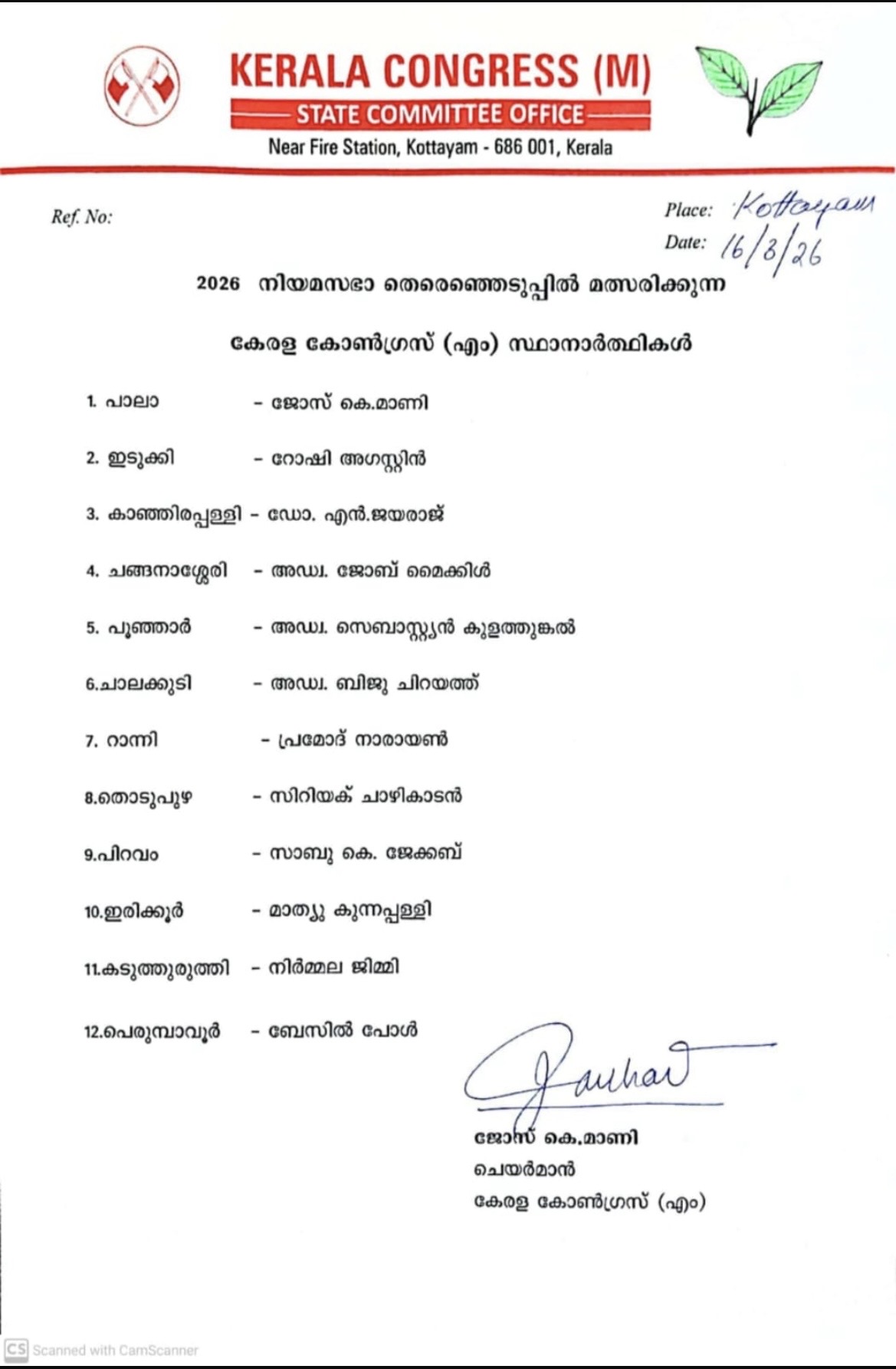 കോട്ടയം: 2026 കേരള നിയമസഭാ തിരഞ്ഞെടുപ്പിനെ മുന്നിൽകണ്ട് കേരള കോൺഗ്രസ് (എം) പാർട്ടി മത്സരിക്കുന്ന മണ്ഡലങ്ങളിലെ സ്ഥാനാർത്ഥി പട്ടിക പ്രഖ്യാപിച്ചു. പാർട്ടി ചെയർമാൻ ജോസ് കെ. മാണിയാണ് കോട്ടയത്ത് നടന്ന പ്രഖ്യാപനത്തിൽ സ്ഥാനാർത്ഥികളെ അറിയിച്ചത്.