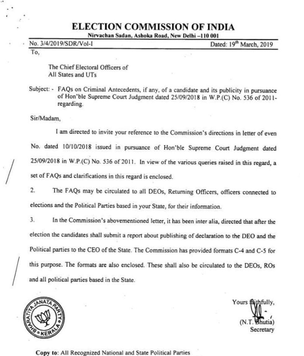 ഈ മാസം 22 നായിരുന്നു തെരഞ്ഞെടുപ്പ് കമ്മീഷന്റെ ഇമെയില് സന്ദേശം സംസ്ഥാനത്തെ രാഷ്ട്രീയ പാര്ട്ടികള്ക്ക് ലഭിച്ചത്. 2019ലെ തെരഞ്ഞെടുപ്പ് ചട്ടങ്ങള് വിശദീകരിച്ചുകൊണ്ടുള്ള സന്ദേശത്തിനൊപ്പമുണ്ടായിരുന്ന തെരഞ്ഞെടുപ്പ് കമ്മീഷന്റെ കത്തിലായിരുന്നു ബിജെപി കേരള ഘടകത്തിന്റെ സീല് ഉള്പ്പെട്ടത്.
